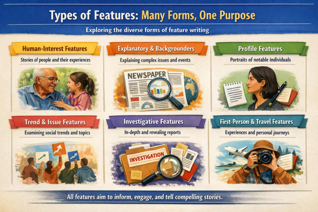 Travel, culture, lifestyle, and narrative long-reads further expand the form. Despite their diversity, all successful features rely on the same fundamentals—clear purpose, strong structure, precise language, and storytelling that connects facts with human experience.