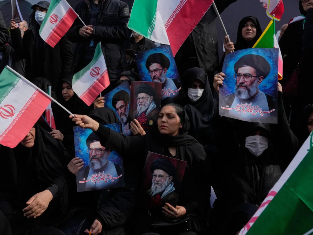 People in Tehran, Iran, wave Iranian flags as they hold posters of the late Supreme Leader Ayatollah Ali Khamenei, showing him at different ages, during a rally to support his son Mojtaba Khamenei, who succeeds his father as the new supreme leader.